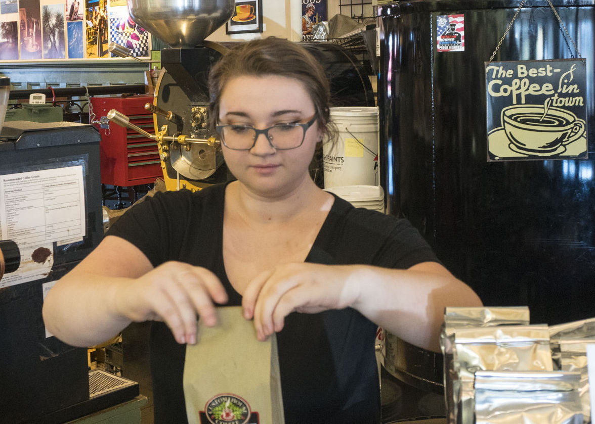 Lauren Cann, empleada de Custom Coffee House, envasa café en el negocio de Middleton. Cann, quien lleva tres años trabajando en Custom House, y otros empleados se convirtieron recientemente en accionistas. Foto: Dave Hansen